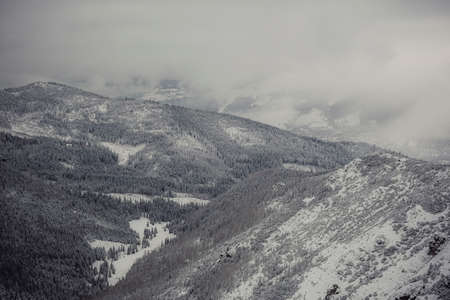 Dark December day in the mountains, Tatra National Park, Poland. Clouds and mist around the ridges. Selective focus on the forest growing on a slope, blurred background.