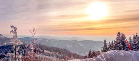 Sunrise and Inversion at Jested mountain close town Liberec, Czech republic, snow and winter and view of funicular.