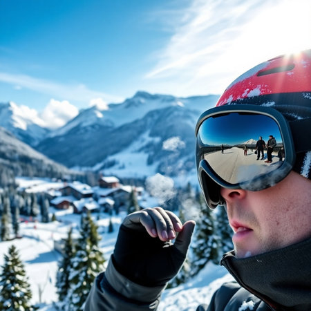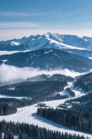 snow-covered pine trees framing an alpine ski slope, created with generative ai