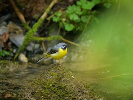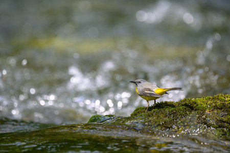 Beautiful yellow bird, Grey Wagtail (Motacilla cinerea) standing on water, bird or Thailand