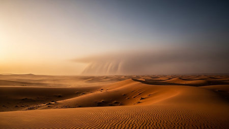 Distant showing vast desert sand dunes under a stormy sky at sunset keywords: desert, sand dunes, landscape,...