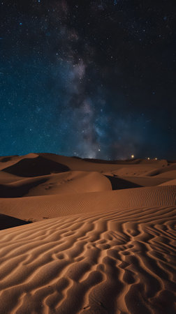 This captivating image showcases the abstract beauty of sandy dunes in the desert. From an aerial perspective, the landscape reveals intricate ripples and textures that create a mesmerizing visual effect. The composition combines the warm tones of the sand with the organic patterns formed by wind and time. Immerse yourself in the serene and otherworldly ambiance of this stunning desert scene, perfect for capturing the essence of tranquility and natural wonder