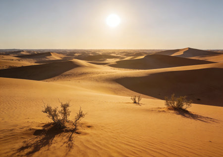 A boundless expanse of golden dunes stretches to the horizon, shimmering beneath a crisp, azure sky in a serene desert scene.