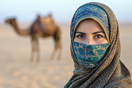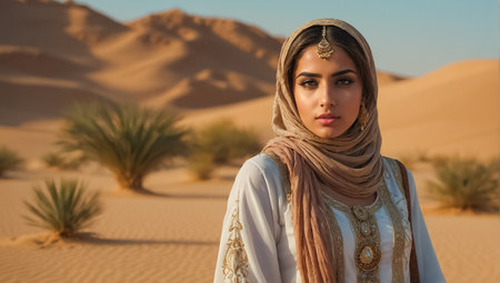 In the vastness of the UAE desert, an Arab woman radiates poise and elegance, celebrating the timeless allure of Arab heritage and traditions AI generated.