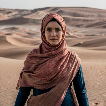 Beautiful Arab woman in hijab looking at camera while standing in the middle of the desert at sunset