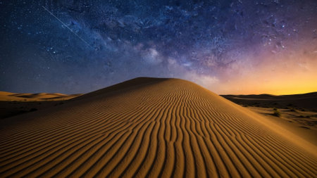 Majestic sand dunes rise under a vibrant sky in the Sahara Desert at sunset showcasing the beauty of nature in a serene landscape