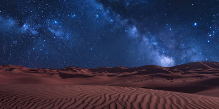 Generative AI : Morocco Sahara desert starry night sky over the oasis Traveling to Morocco Glow over the palm trees of the oasis Billions of stars in the night sky milky way Panora