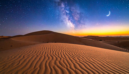 A mesmerizing desert landscape showcases undulating sand dunes bathed in warm hues during dusk, creating a serene and tranquil natural setting under a colorful sky.