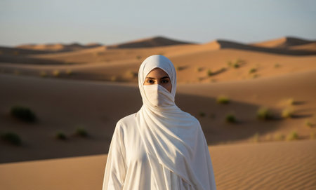 Generative AI Image of Arabian Woman Wearing Hijab in the Desert at Sunset Sunrise