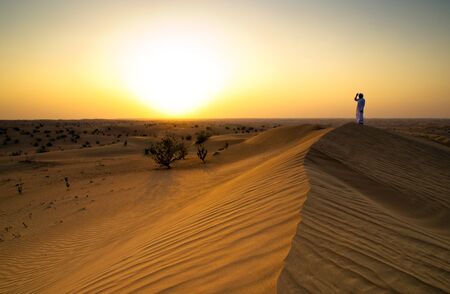 Arabian sheikh in long white dress closeup in the middle of Dubai desert.