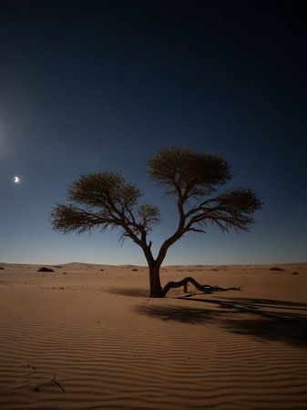 A solitary acacia tree stands in rippled desert sand dunes under a dark night sky with a crescent moon and scattered stars.
