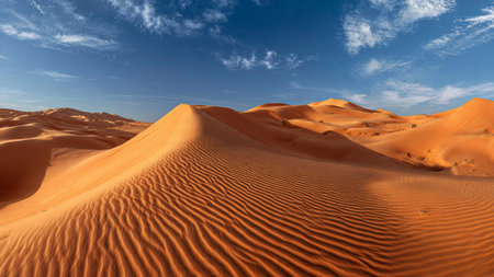 This stunning photograph captures a vast desert landscape with rolling sand dunes under a vibrant blue sky adorned with soft clouds. Ideal for travel and nature themes.