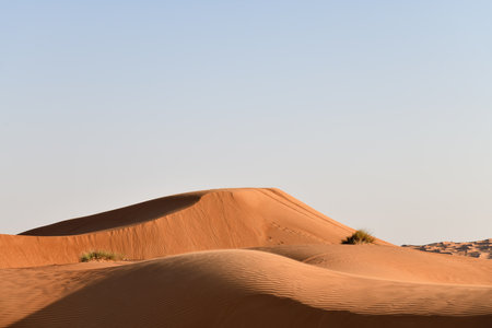Desert contrast of orange colored sand and bright blue sky in the rolling hills in Ras al Khaimah, in the United Arab Emirates.