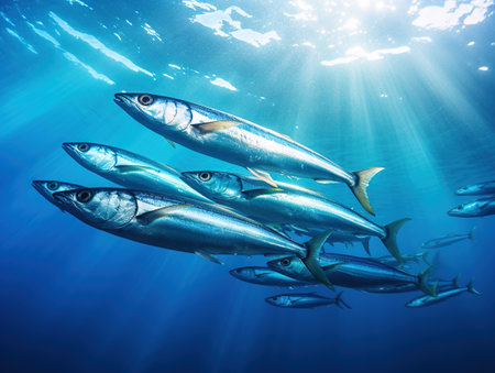 A school of tuna fish glides through crystal-clear ocean waters, surrounded by marine life, representing sustainable fishing and aquatic ecosystems