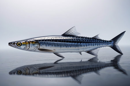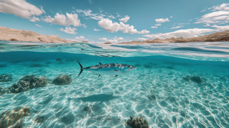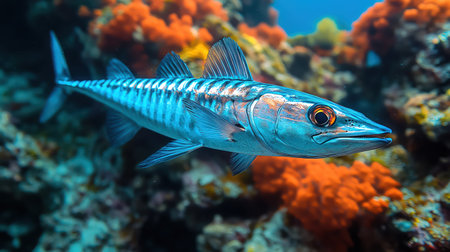 A stunning barracuda glides through the clear ocean waters, showcasing its sleek body and powerful fins while surrounded by a vibrant underwater ecosystem.