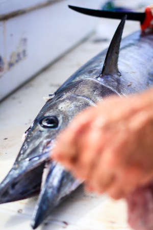 A detail of fresh caught fish cutting and cleaning in fisherman beach Punta Lobos near todos santos, pacific ocean baja california sur mexico