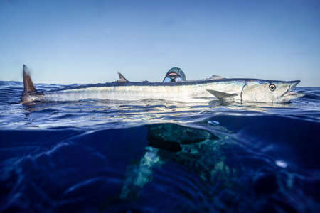 Great Barracuda (Sphyraena barracuda) on deck of a ship, caught by sportfisher