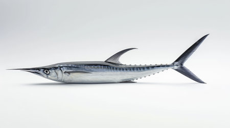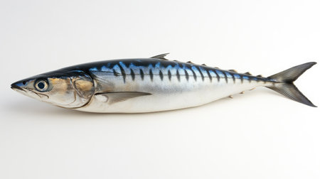 Mackerel fish with glistening silver-blue skin isolated against a white backdrop, ideal for seafood market visuals