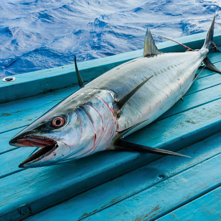 A stunning illustration of a tuna fish, showcasing its vibrant colors and intricate details against a serene blue backdrop.