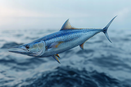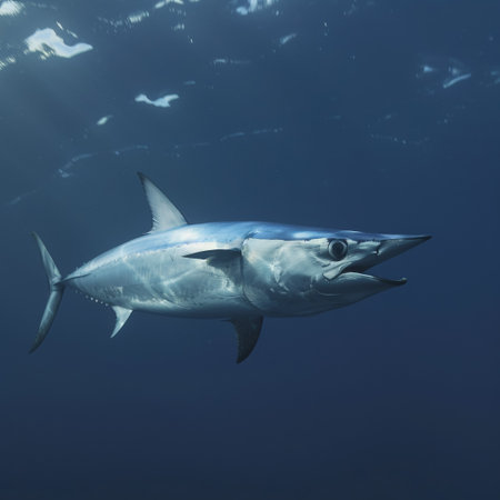 A sleek, fastmoving barracuda swims through the deep blue ocean, with sunlight streaming down