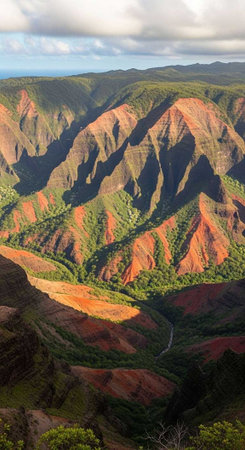A breathtaking landscape of rugged mountains with lush greenery and red soil under a cloudy sky