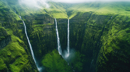 Witness the breathtaking beauty of a majestic waterfall nestled within a dense green jungle, surrounded by lush foliage and mist, offering a serene escape into nature