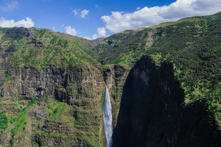 Aerial view of Manawaiopuna Falls and landscape of hawaiian island of Kauai from helicopter flight