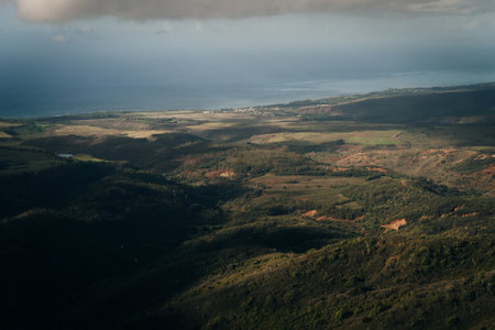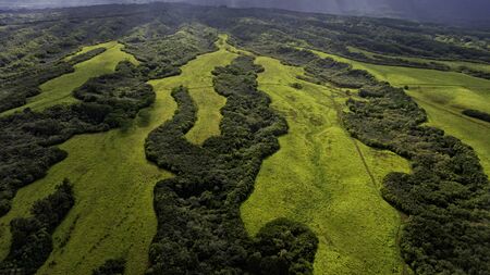 Aerial view from a fixed wing airplane of interior Kaui, Hawaii, USA near Lihue showing lush green meadows, tropical forests