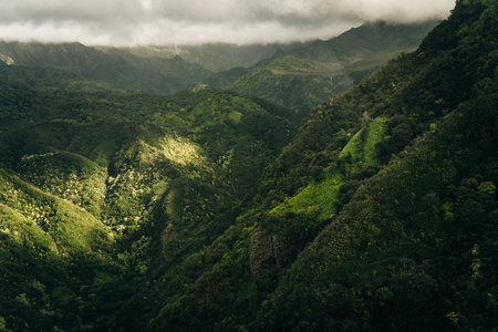 Experience the breathtaking beauty of lush green mountains under a cloudy sky, showcasing rugged terrain and vibrant foliage in a serene tropical landscape.