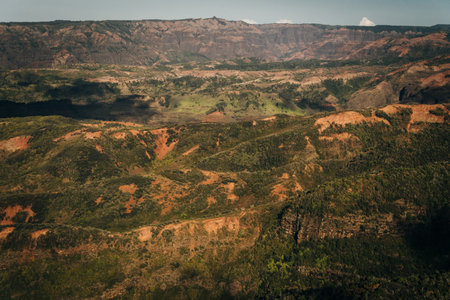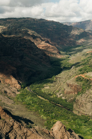 Aerial view of Waimea Canyon Grand Canyon of the Pacific on the western side of Kauai island in Hawaii. High quality photo