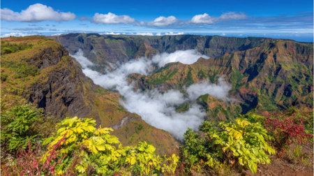 Green lush Waimea canyon south rim on Kauai Hawaii with blue sky and clouds.