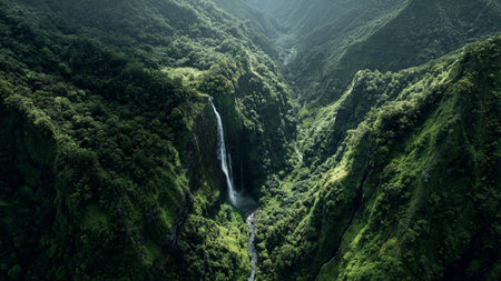 Discover a serene landscape featuring majestic green mountains and a captivating waterfall. The mist enhances the natural beauty and tranquility of this tropical paradise.