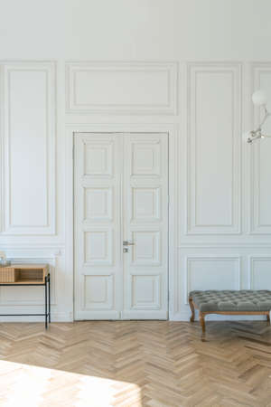 3d rendering illustration of light living room with luxury white plaster wall, molding and hardwood floor. Bright classic interior on sunny morning.