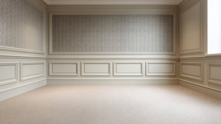 This image showcases an elegant empty room featuring soft neutral carpet and textured wallpaper, exemplifying modern interior design principles. The clean lines and soft color palette create a serene and inviting atmosphere, perfect for various design concepts.
