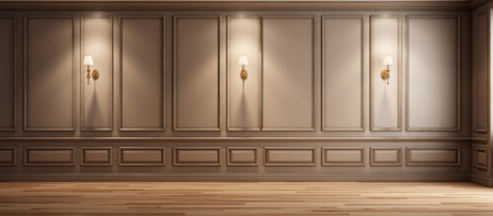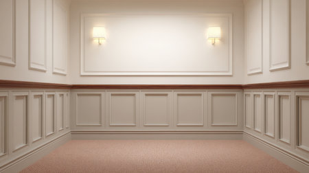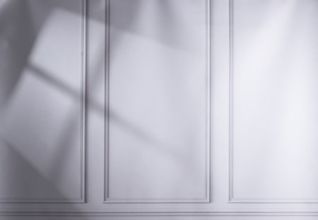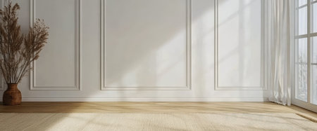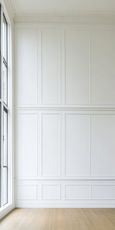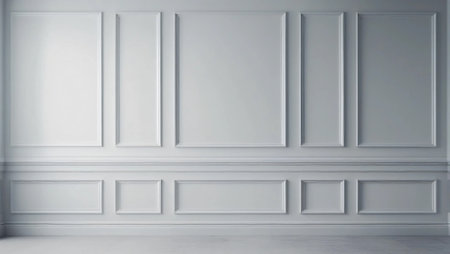 Blank white painted wall with elegant classic paneling, realistic empty home apartment interior, wall mockup for wallpaper or artwork placement