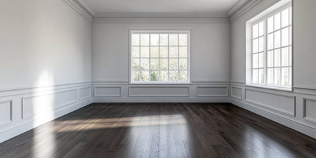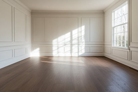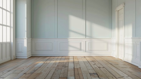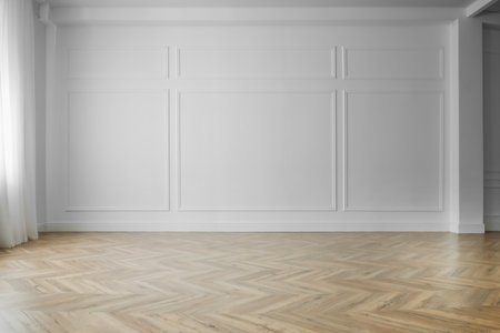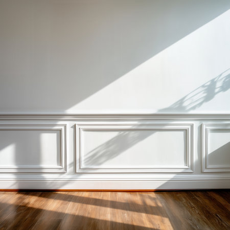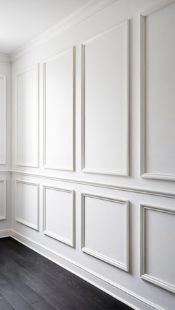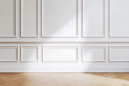 Elegant white wall with traditional wainscoting and decorative moldings against dark hardwood flooring. Interior design, home renovation, and architectural detail themes.