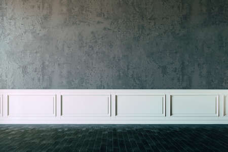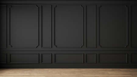 Modern classic black empty interior with wall panels and wooden floor. 3d render illustration mock up.