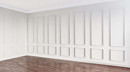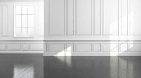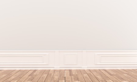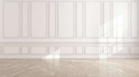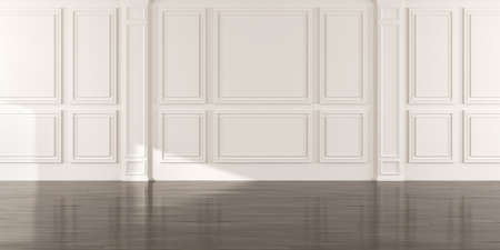 3d rendering illustration of living room with luxury white plaster wall, molding and hardwood floor. Classic interior on sunny morning.