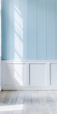 Classic white wainscot on empty blue wall. Retro panel wall and wooden floor room interior background. Beadboard wood decoration. 3d render