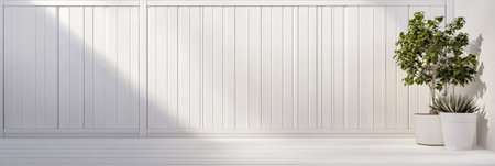 A serene outdoor area features a crisp white wooden fence casting soft shadows on a light colored floor. A small potted plant adds a touch of greenery enhancing the tranquil atmosphere.