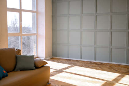 The modern room is empty with large panoramic windows in the living room. Interior photo studio minimalist design. Wooden parquet floor covered with colorless varnish.