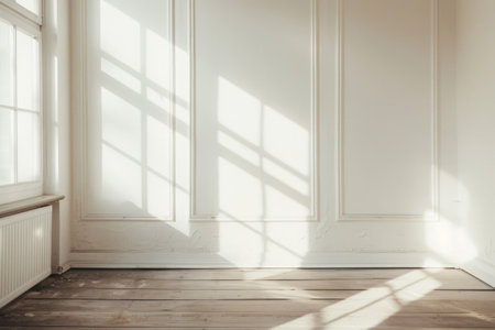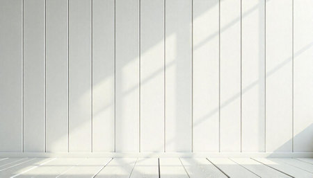 An empty, sunlit room with gentle light creating elegant shadows on a wooden panel wall, offering a tranquil and aesthetically pleasing setting