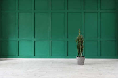 wall in the interior with parallel and vertical stripes of calm color. Parquet floor and white plinth. Wall design in the interior.