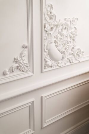 Stucco elements on light luxury wall. White patterned. Roccoco style. Close up. Selective focus.