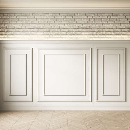 Classic loft interior with white wall panel, moldings and brick wall. 3d render illustration mockup.