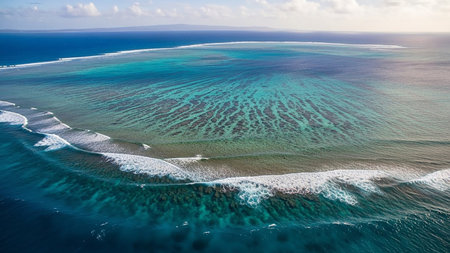 Paradise showing aerial view of a vibrant turquoise coral reef lagoon with clear shallow water revealing intricate patterns and white waves crashing on the outer...