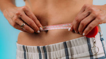 Close up hand of a woman measuring her waist with measuring tape.