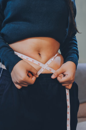 fat woman, fat belly, chubby, obese woman hand holding excessive belly fat with measure tape, woman diet lifestyle concept