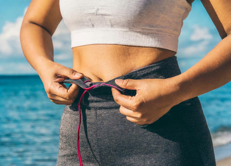Close up of a young woman measuring her waistline on the beach