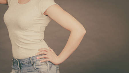 Woman wearing tight jeans and shirt on light gray background, closeup. overweight problem